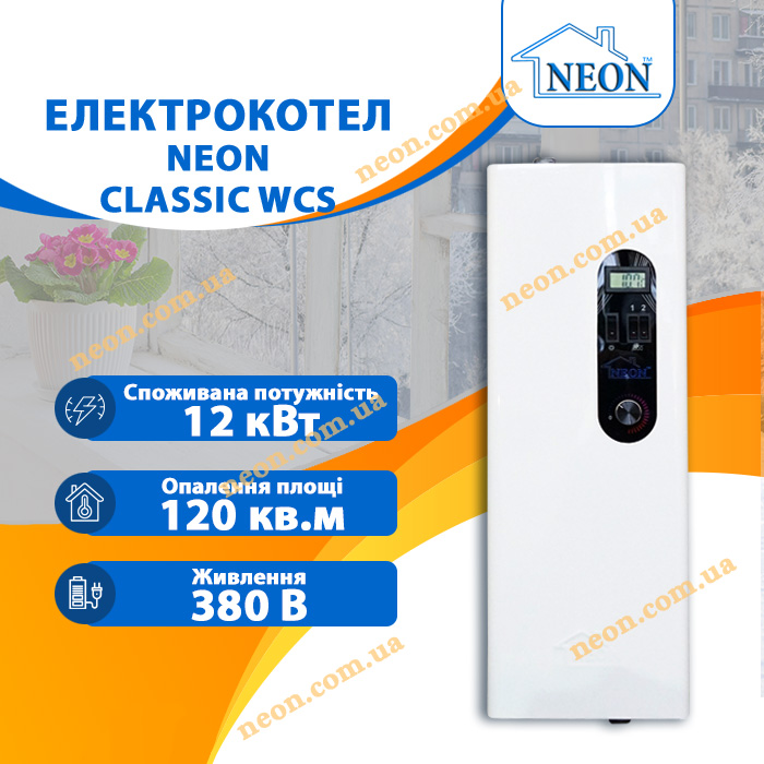- Бесшумный симисторный электрокотел без насоса Neon Classic WCS 12 кВт, который предназначен для автономного отопления частных домов и небольших общественных помещений площадью до 120 кв. м