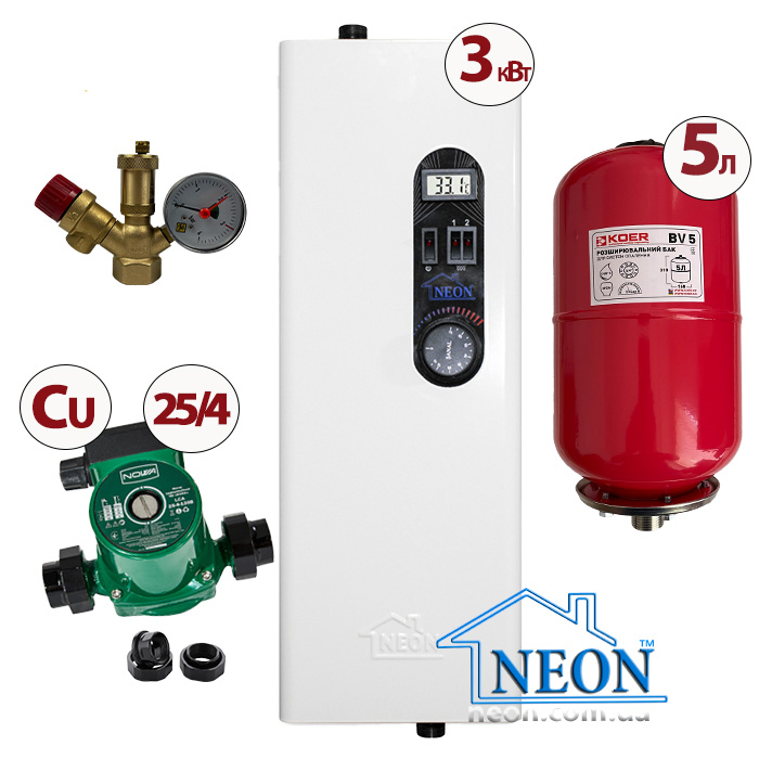Комплект электрокотла Neon Classic 3 кВт с насосом 25/4 (медная обмотка), бачком на 5 л и группой безопасности