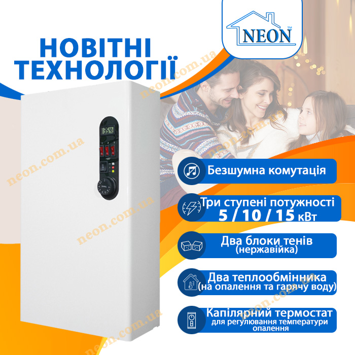 Двухконтурный электрокотел NEON DUOS Maxi 15 кВт (с расширительным бачком для системы отопления и гидравлическим предохранительным клапаном) предназначен для автономного отопления и горячего водоснабжения частных домов и небольших общественных помещений площадью до 150 кв. м, в закрытых отопительных системах с принудительной циркуляцией теплоносителя.