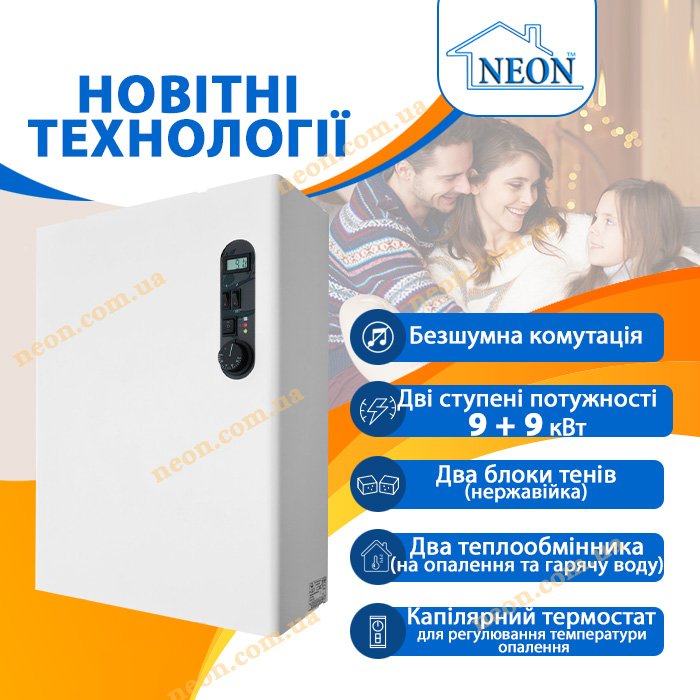 - Котел NEON DUOS Maxi 18 кВт имеет две ступени мощности: 9 – 18 кВт