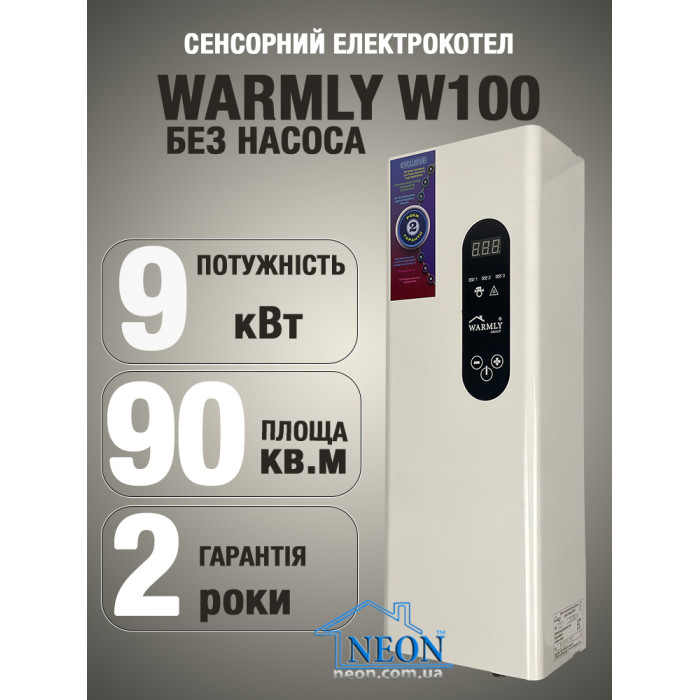 Максимальна потужність котла Warmly W100 9 становить 9 кВт, що розраховано для опалення приміщень площею до 90 кв. Включення потужності здійснюється трьома ступенями 3 – 6 – 9 кВт