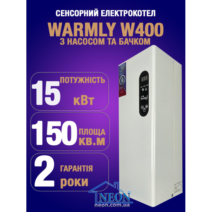 Максимальная мощность котла Warmly W400 15 составляет 15 кВт, что рассчитано для отопления помещений площадью до 150 кв.м. Включение мощности осуществляется тремя ступенями 5 – 10 – 15 кВт