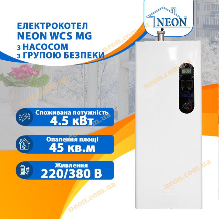 Настенный электрокотел Neon Classic MG 4,5 (S) (бесшумный) c насосом, с группой безопасности (автоматический воздухоотводчик и предохранительный (подрывной) гидравлический клапан), без расширительного бачка.