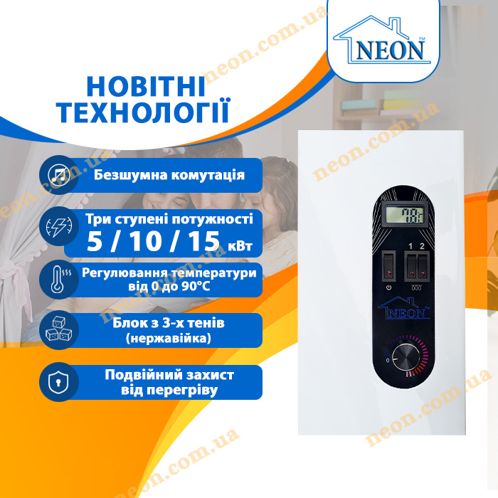 Коммутация котла Neon Classic M 15 S (бесшумный) выполнена на основе симисторов (S), что обеспечивает бесшумное включение ТЭНов.