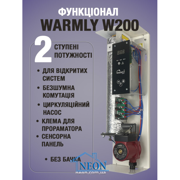 Настенный симисторный электрокотел Warmly W200 3 кВт с бесшумной коммутацией, с насосом и без расширительного бачка.